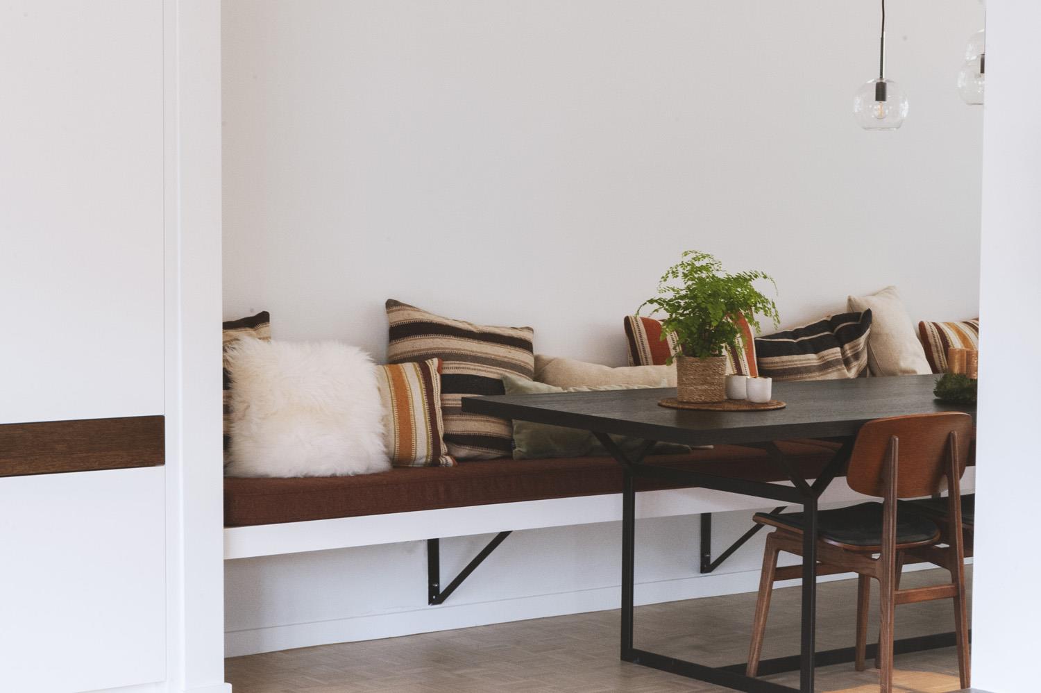 Een renovatie waarbij we de leef- en eetruimte hebben voorzien van nieuw meubilair en decoratie. Hierbij hielden we rekening met de gezinssituatie van het koppel en de karaktervolle uitstraling van de woning. In samenwerking met Jones Living stonden we in voor het schrijnwerk op maat zoals de ingemaakte tv-kast, kastenwand met bureau en de bank aan de eettafel.